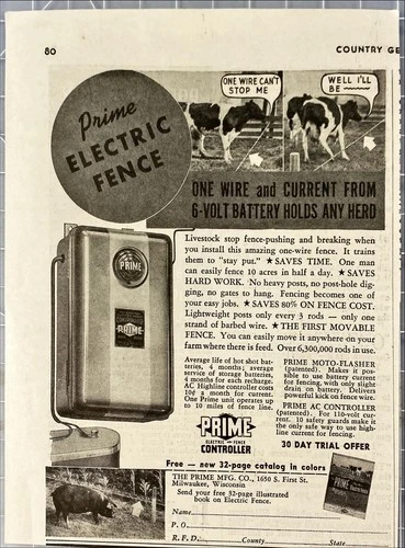 Prime Electric Fence "1 Wire & 6-Volt Current Holds Any Herd" Vtg Print Ad 1937