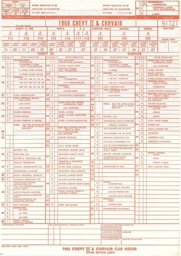 1966 CHEVY ll and CORVAIR ORDER FORM Mfg Retail Window ON 65 lb paper COPY