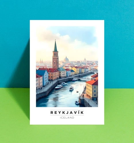 Reykjavik Wall Art Print – Reykjavík Iceland Travel Poster, Colorful Harbor City