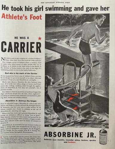 1937 Absorbine Jr Athletes Foot Muscle Aches Sunburn Spgfl Mass Vintage Print Ad