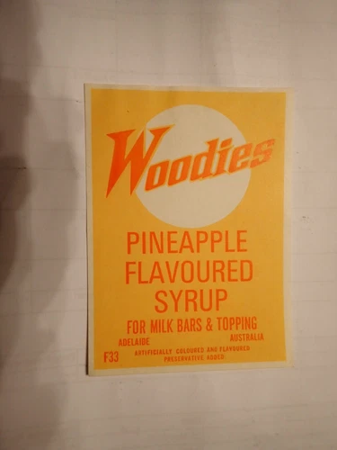 WOODIES PINEAPPLE FLAVOURED SYRUP FLAVOURED LABEL ORIGINAL UNUSED ADELAIDE SA