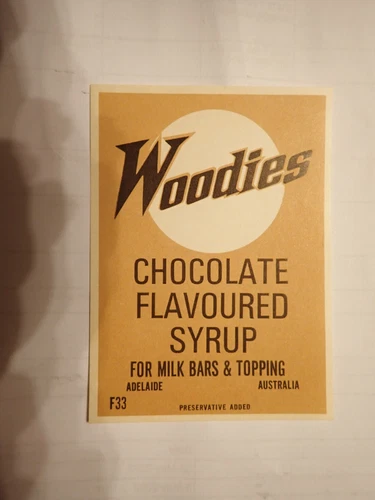 WOODIES CHOCOLATE FLAVOURED SYRUP FLAVOURED LABEL ORIGINAL UNUSED ADELAIDE SA