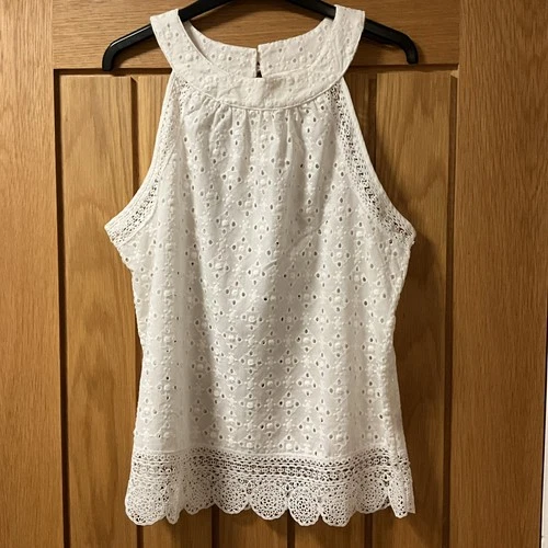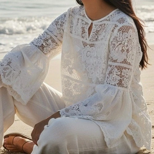 Adiva White Floral Lace Bell Sleeve Boho Blouse Women Medium Scalloped Hem Top