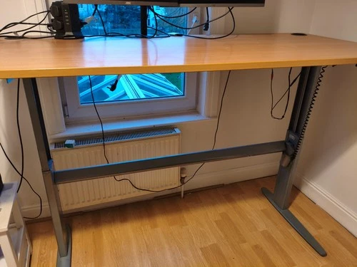 Adjustable work desk - sit and stand. Wooden top with sturdy steel legs