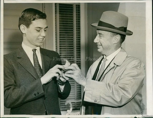 1956 Photo Pres Condidate Adlai Stevenson & Son John Fell Toy Duck Politics 7X9