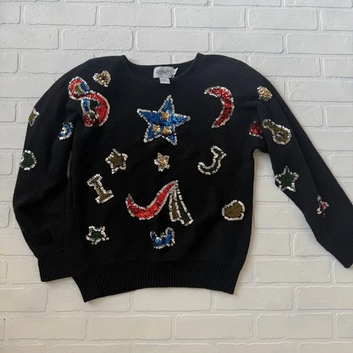 Affinity by Margo's Women's Black Sequin Vintage Holiday Sweater Star Moon sz M