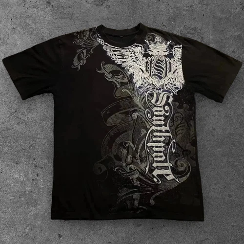 Mens Crown Angel Wings Oversized T Shirt Black Affliction Streetwear S-2XL