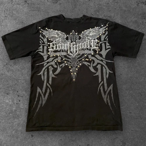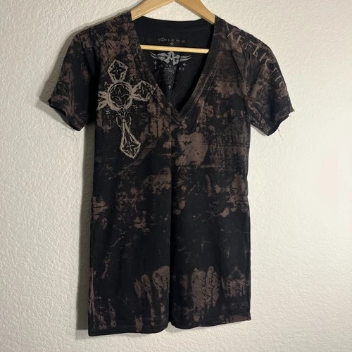 Affliction Graphic V-Neck Top Womens Small Burnout Cross Embroidered Y2K Goth