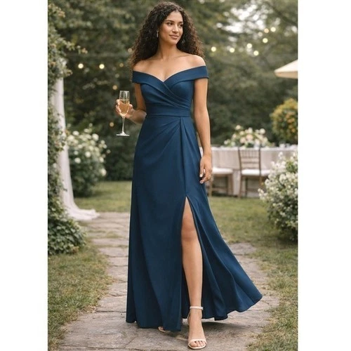 After Six 6872 Off Shoulder Faux Wrap Maxi Dress Atlantic Blue Gown Size 12 NWT