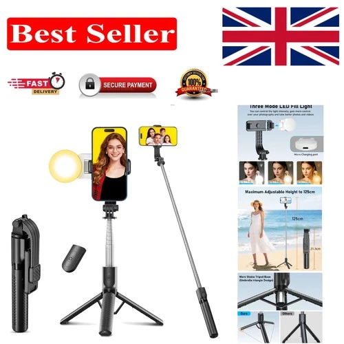 Selfie Stick Tripod with Adjustable LED Light - 0.22 kg, Water-Resistant