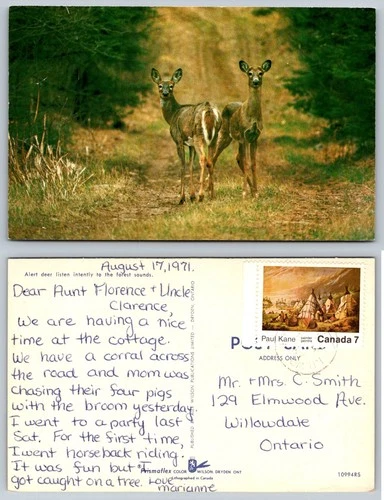 1971 Dryden Ontario Postcard Two Alert Deer Fawns Forest Path Paul Kane Stamp