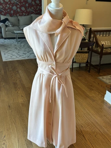 1960-1970s Allison Ayres Sz 10 Baby Pink V Neck Button Down Midi Dress Scarf