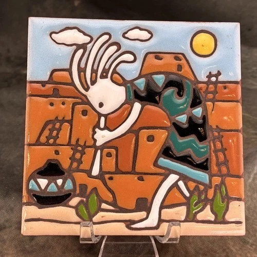 Earthtones Kokopelli Clay Tile Art 4”x4" Dated 1995 Orig Sticker Native American
