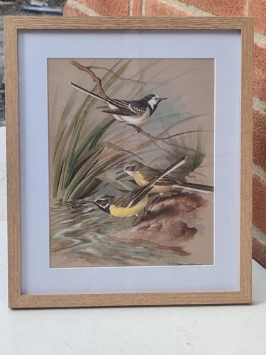 Basil Ede, Pied and Grey Wagtail Birds, 1965 Print, New Frame/Glass/Stand VGC