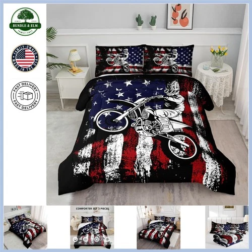 American Flag Dirt Bike Bedding Set, Twin Comforter with U-Shape Stitching