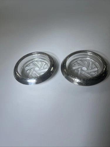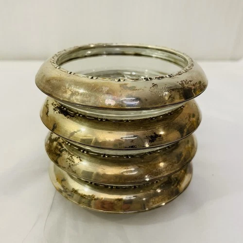 Set Of 4 Vintage 1950s Amston Sterling Silver 144 Rimmed Glass Crystal Coasters