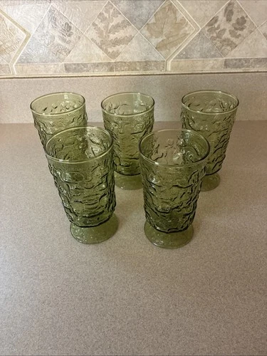 5 Anchor Hocking MILANO Avocado Green 5.75” T, 10oz. Footed Glass Bark Textured