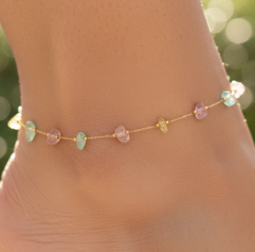 Boho Pastel Tourmaline Beaded Anklet 18K Gold Plated Minimalist Chain Anklet