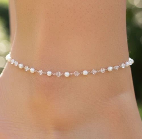 Boho Pearl & Topaz Beaded Anklet Silver Tone Minimalist Chain Anklet for Women