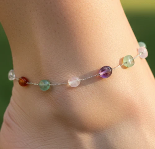 Boho Multi Tourmaline Beaded Anklet Silver Tone Minimalist Chain Anklet for Her