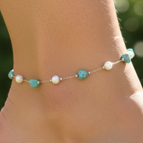 Boho Turquoise and Pearl Beaded Anklet Silver Tone Minimalist Chain Anklet