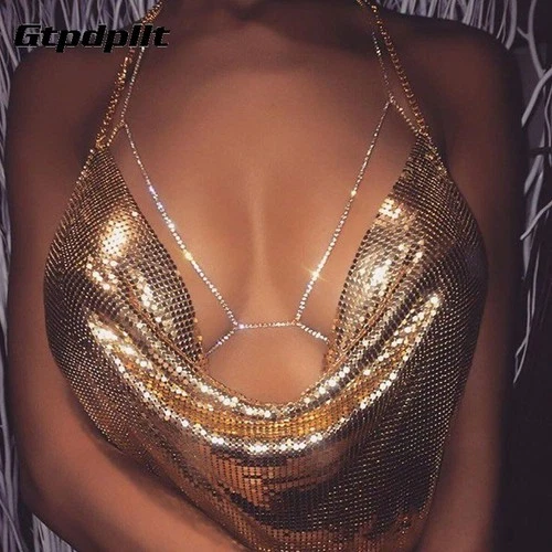 Elegant Shiny Metal Gold Chainmail Halter Top With Sexy Bustier Bra Chain Set