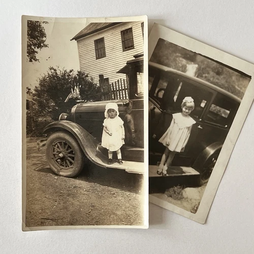 Antique Snapshot Photograph Adorable Little Girl Standing On Side Of Car