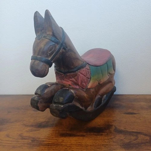 Vintage Hand Carved Wooden Rocking Horse Appeal Figurine H 10" L. 11" Boho