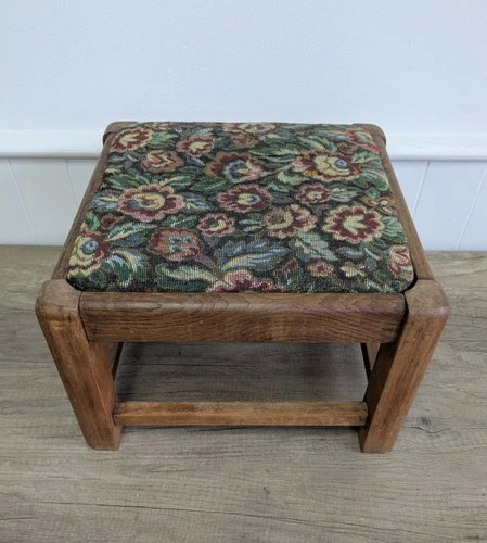 Vintage Victorian Style Wood Footstool Floral Needlepoint Tapestry -Home Decor