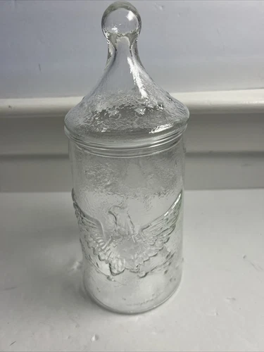 VTG Clear Embossed Glass American Eagle/Stars Lidded Apothecary Candy Jar 10”
