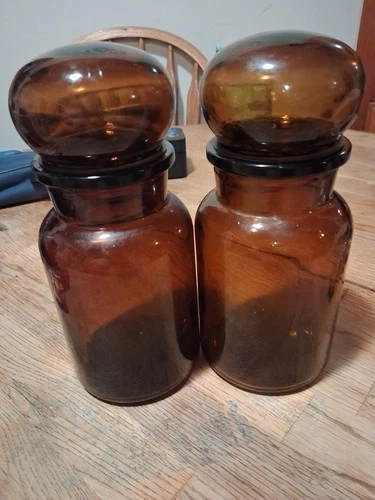 VTG Lot 2 ~ Belgium Amber Apothecary Jar Bubble Top Lid Bottle Brown Glass 8.5"