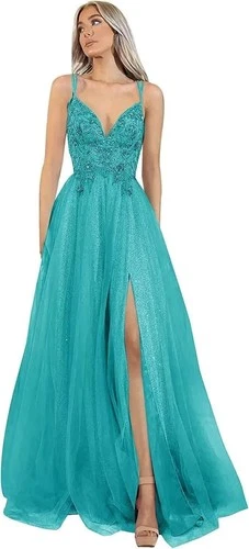 Sparkly Tulle Prom Dresses Beaded Applique Evening V-Neck Formal Party Dress