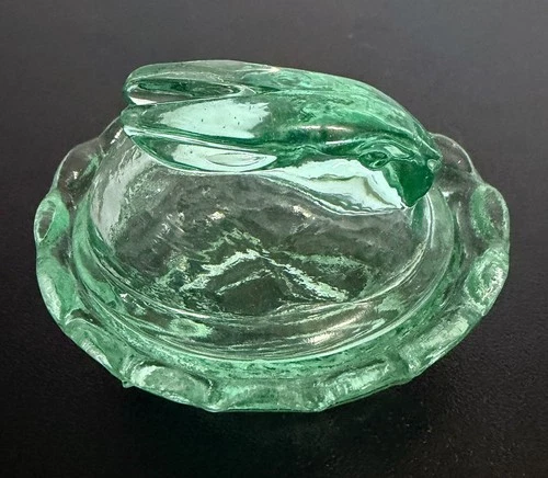 Teal turquoise uranium glass rabbit on nest salt cellar