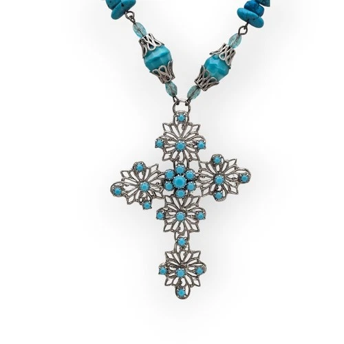 Vintage Faux Turquoise Cross Pendant Necklace Boho Glam Old World Style