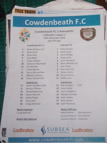 Teamsheet 2016/17 Cowdenbeath v Arbroath Dec 24
