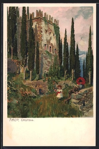Artist postcard Zeno Diemer: Arco, Castell, visitors to the castle