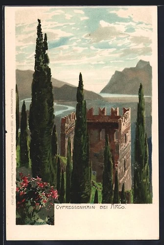 Artist postcard Zeno Diemer: Arco, cypress grove with tower ruin
