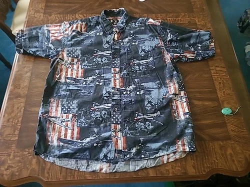 Red Head Mens XL Blue Patriotic Military Plane American Flag Button Up Shirt
