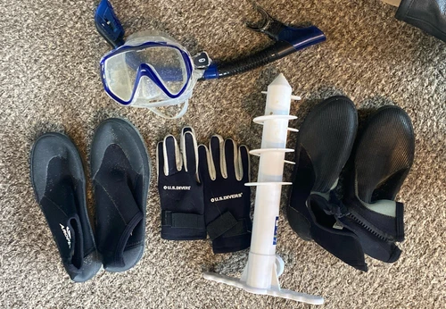 Scuba Diving Accessories- Scuba Shoes Size 11 and 8, Snorkel, Gloves, Anchor