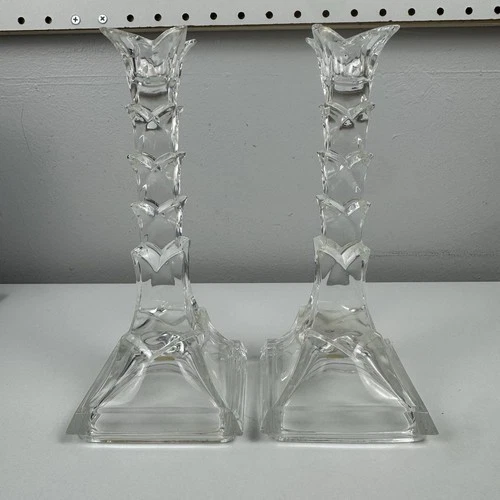 Vtg 1980s Crystal Clear Lead Crystal Candlesticks Pair USA Art Deco Style