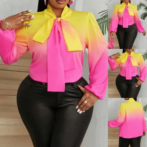 Plus Size Women Bowknot Tie Shirt Long Sleeve Work Casual Gradient Tops Blouse