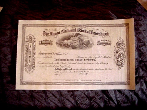 THE UNION NATIONAL BANK of LEWISBURG Unissued Stock Certificate with Artworks