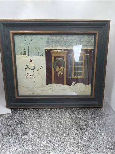 Warren Kimble Framed Print American Folk Art "House w/Snowman & Rabbit"