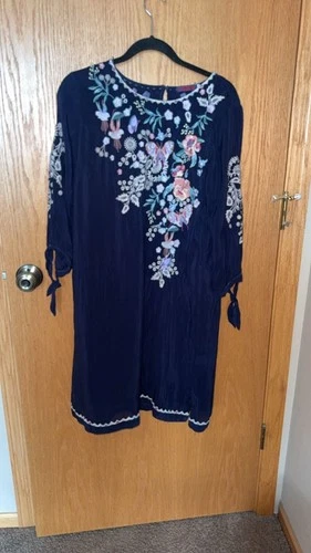 Johnny Was Arva Embroidered Cupra Silk Dress in Eclipse Blue. 2PC set