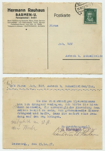 93250 - Postcard Hermann Rauhaus - Barmen 25.10.1927 to Asbach