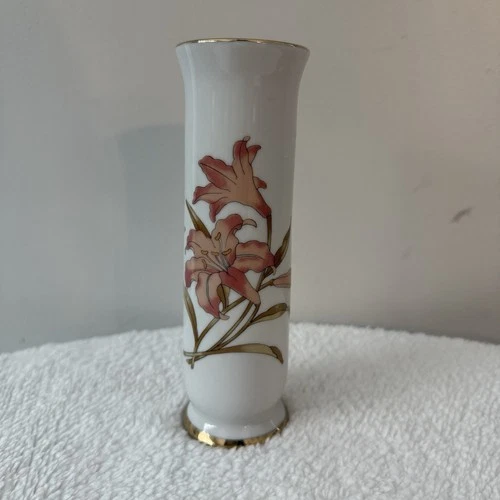 Japanese Porcelain Bud Vase Coral Asiatic Lily w/ Butterfly Gold Trim VTG Japan