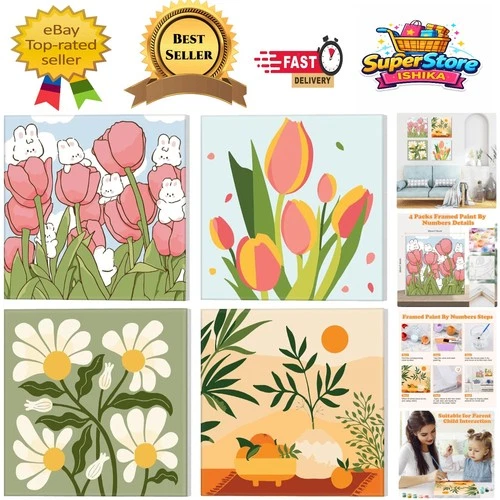 Creative Floral Paint by Numbers Kit - 4 Framed 8x8inch Canvas Art Pieces