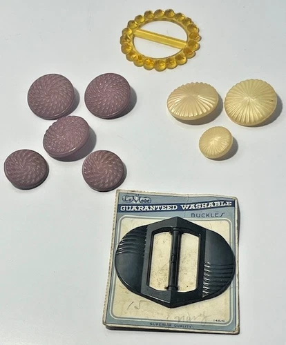 Vintage Mixed Sewing Lot Two Sets of Buttons & Two Buckles