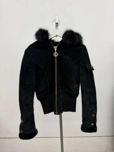 Vintage Baby Phat Suede Jacket Women's M Black Faux Fur Lining Hooded Full Zip