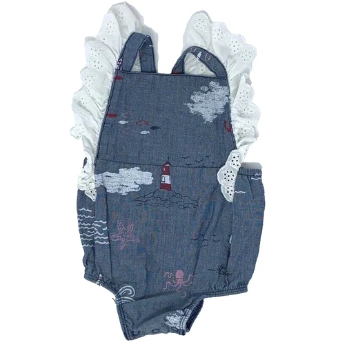 Mud Pie Baby Girls 3-6 Months Blue Chambray Nautical Lighthouse Lace Trim Romper